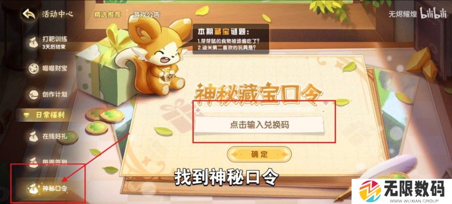 2、点击神秘口令:在活动中心页面左侧,选择【神秘口令】。