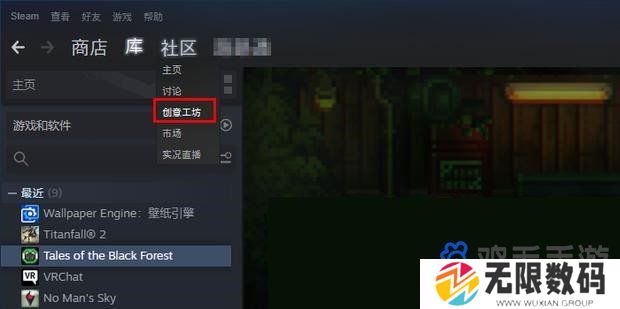 答:在steam页面点击社区,在弹出的设置选项中点击创意工坊即可进入