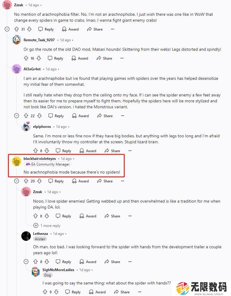 不过很快就有玩家发现,在辅助功能中并没有看到应对蜘蛛恐惧症(有说法认为大约每二十个人中就有一人患有蜘蛛恐惧症,所以游戏中设置应对模式越来越流行)的相关选项,这引起了部分玩家的担忧。有玩家表示希望《龙腾世纪:影幛守护者》可以提供类似《魔兽世界》那样将蜘蛛全部变成螃蟹的“蜘蛛恐惧症模式”。