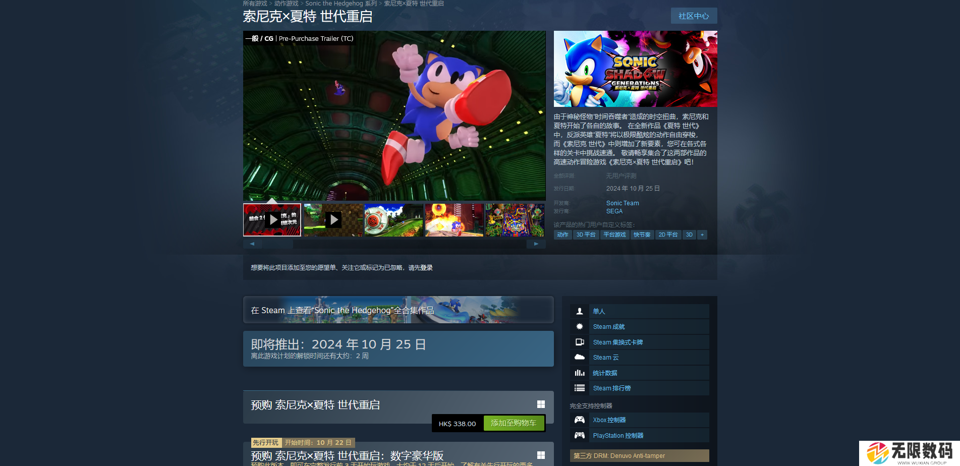 《索尼克×夏特 世代重启》Steam版的上线时间为2024 年 10 月 25 日上午10点左右,预载时间大概是前一天,也就是10月24日。