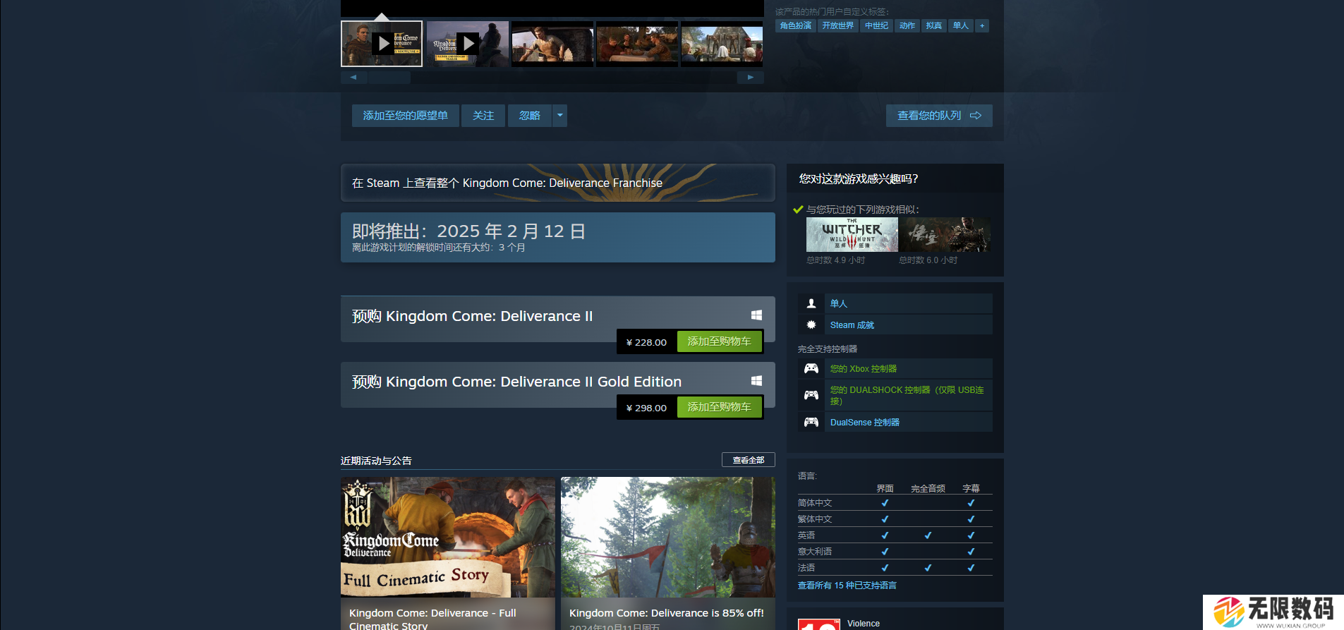 《天国:拯救2》在Steam平台有标准版和豪华版,售卖价格分别是人民币228元和人民币298元。