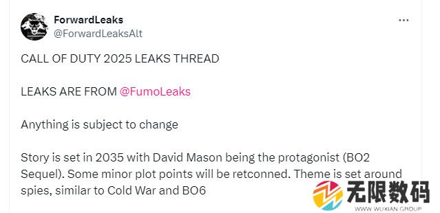 根据推主@FumoLeaks爆料,《使命召唤2025》故事设定在2035年,主角是《黑色行动2》主角David Mason,一些次要情节将被重新设定。仍然是谍战,类似于《使命召唤17:黑色行动冷战》和《使命召唤21:黑色行动6》
