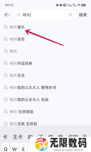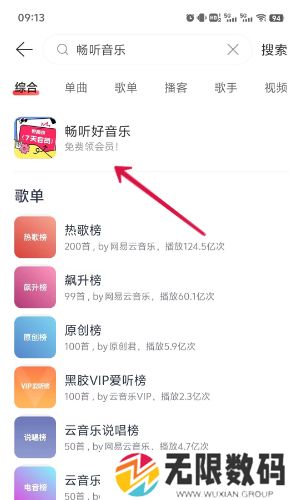 1、打开网易云音乐APP在上方的搜索框内输入关键词:畅听音乐,点击搜索;