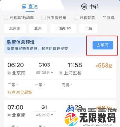 2、来到查询车票页面后,点击购票信息预填右侧的去填写;