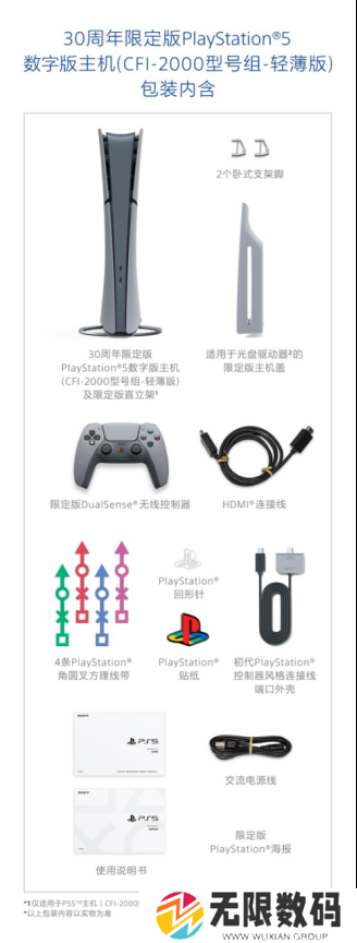 30周年限定版PlayStation®5数字版主机(CFI-2000型号组-轻薄版)包装内含: