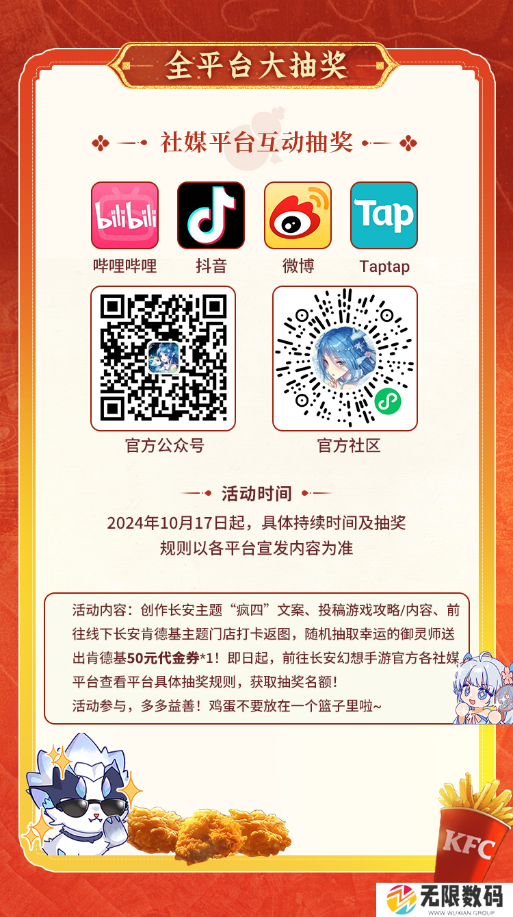 ¡ 社媒平台互动抽奖:具体持续时间及抽奖规则以各平台宣发内容为准,抽奖活动内容包括:创作长安主题“疯四”文案、投稿游戏攻略/内容、前往线下长安肯德基主题门店打卡返图等