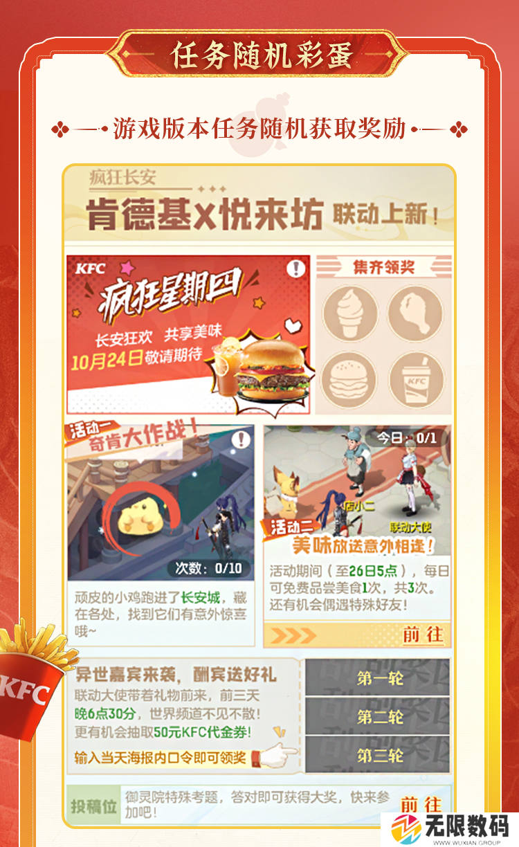 除了以上的游戏内KFC联动活动,还有一系列专属福利和活动,V你50没商量。这一次,长安幻想还准备了许多专属联动福利,让所有御灵师都能享受到联动福利,畅玩长安,同庆美味盛典!