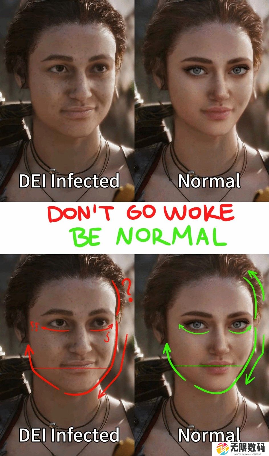 近年来许多欧美游戏里的女性角色变得越来越丑,许多玩家开始指责开发商受LGBT影响,故意丑化女角色。近日,一位阿根廷博主在推特上发图文,展示了这些游戏女角究竟丑在哪儿,要如何才能变得正常。一起来看看他的图吧!