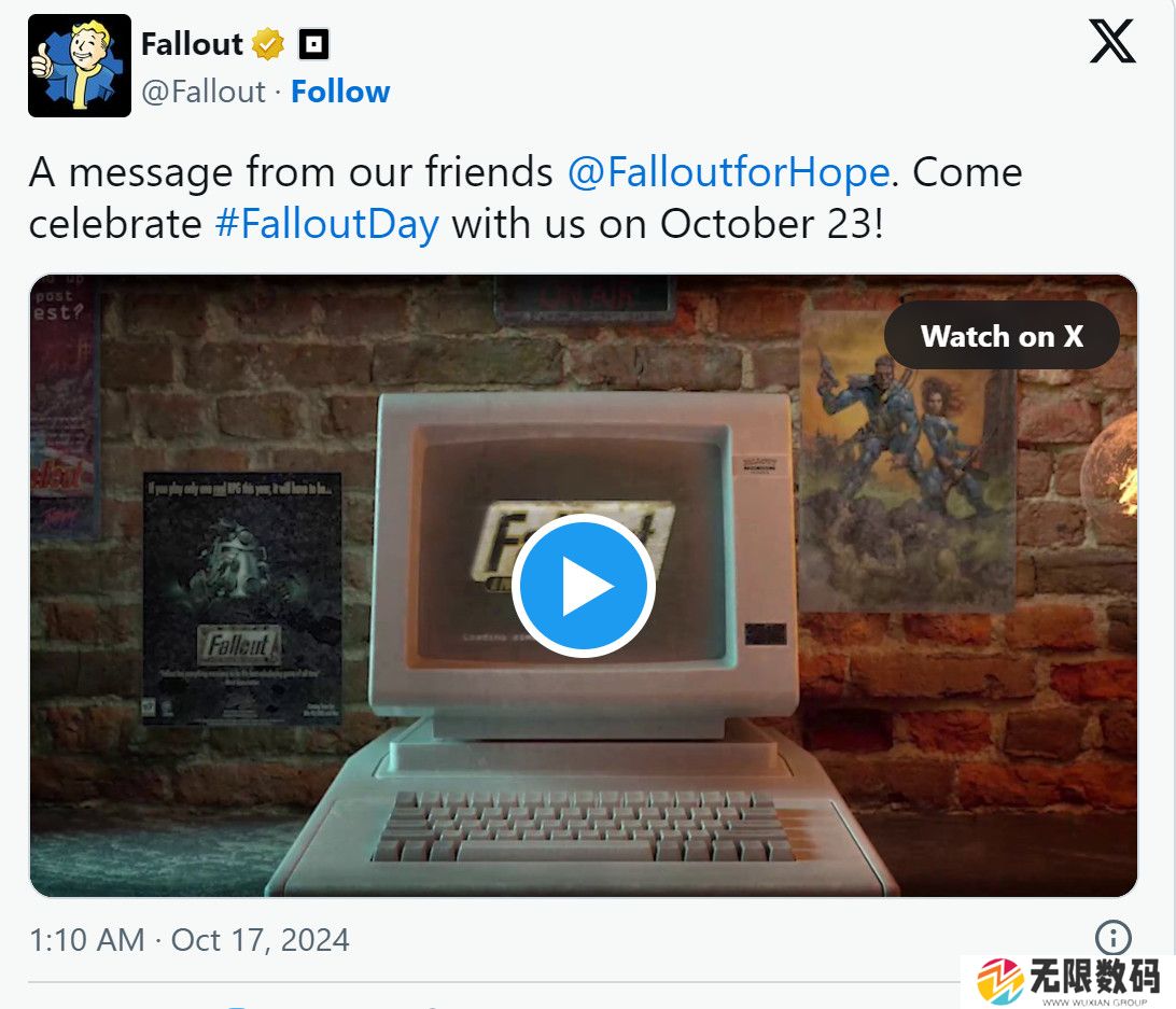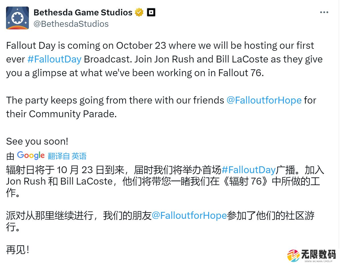 B社官推宣布,今年的“辐射日(Fallout Day)”将于当地时间10月23日到来,届时B社将于北京时间10月24日凌晨3点举行史上首次“辐射日”直播节目,创意总监Jon Rush和系列最近作制作人Bill LaCoste将展示团队在《辐射76》这个游戏上的最近工作成果。此外,一个由社区经营的慈善活动FalloutforHope也将在这次的直播中亮相。
