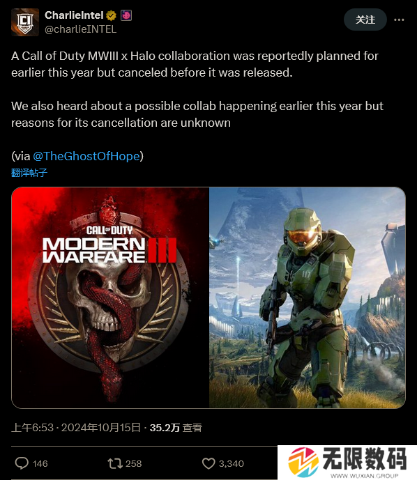 他写道:“《光环》与《使命召唤》士官长联动包居然因为完全位置的原因被取消了。”