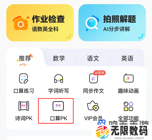 1、进入主页,点击口算PK进入详情页。