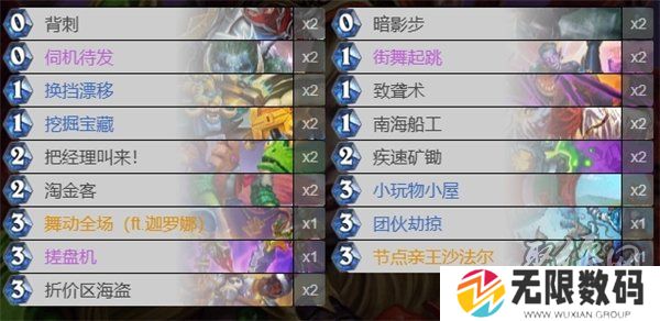 在这一构筑中,新加入的“摄影师”可以有效防止“法术迸发”将增益效果错误地传递给船工,避免无法回手的尴尬局面。卡组的灵活性得到了增强,“礼物”替换掉了“背刺”,让你在对局中能够更随意地应对各种情况。新加入的“街舞起跳”也提供了更多的斩杀机会,或帮助你在关键时刻回手南海船工。